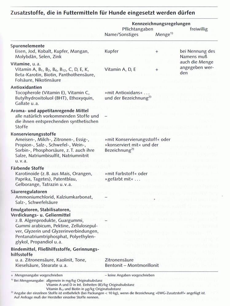 So gibt es zahlreiche synthetische Zusätze wie synthetisches Vitamin A und Kupfer, die laut Futtermittelverordnung ausweispflichtig sind, da Überdosierungen schwere Gesundheitschäden nach sich ziehen oder tödliche Folgen haben können.